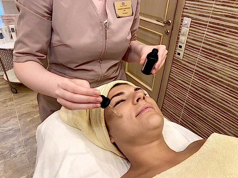 - На завершающем этапе осуществляют финальный уход. Он включает нанесение эссенции с микроводорослью или лифтинг-крема для зоны вокруг глаз, трипептидного крема или эмульсии «Городская защита» SPF30.