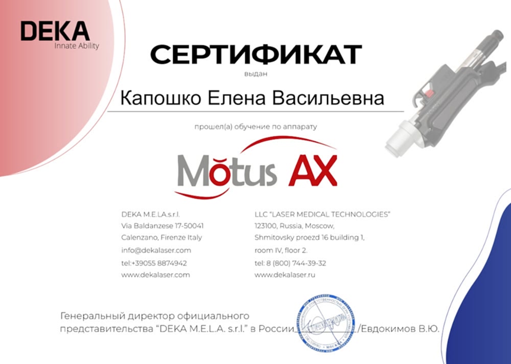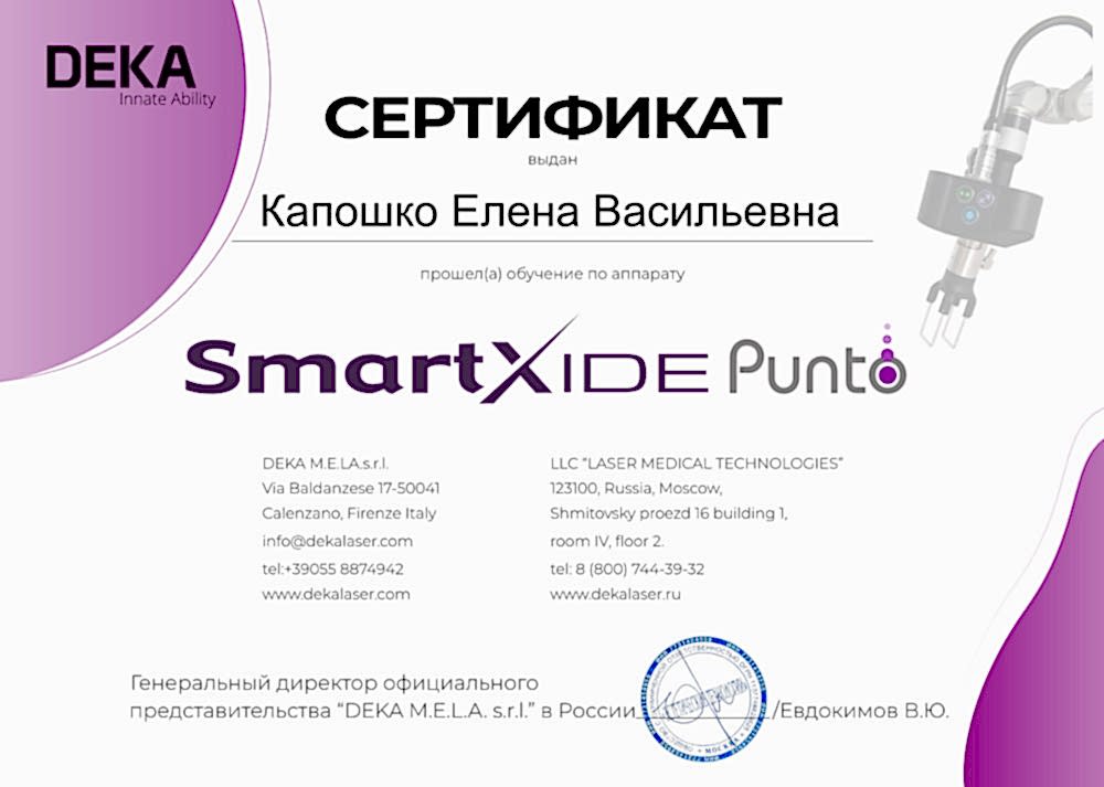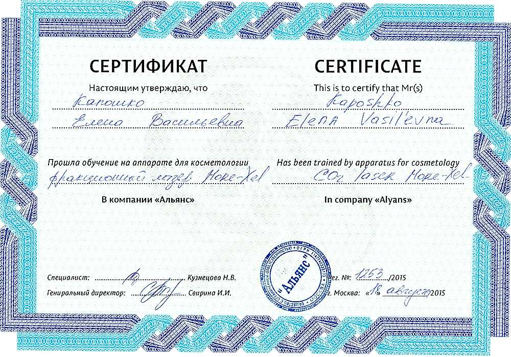 В 2024 г. прошла курс повышения квалификации по специальности «Косметология» на базе АНО ДПО «Центр медицинского и корпоративного обучения».