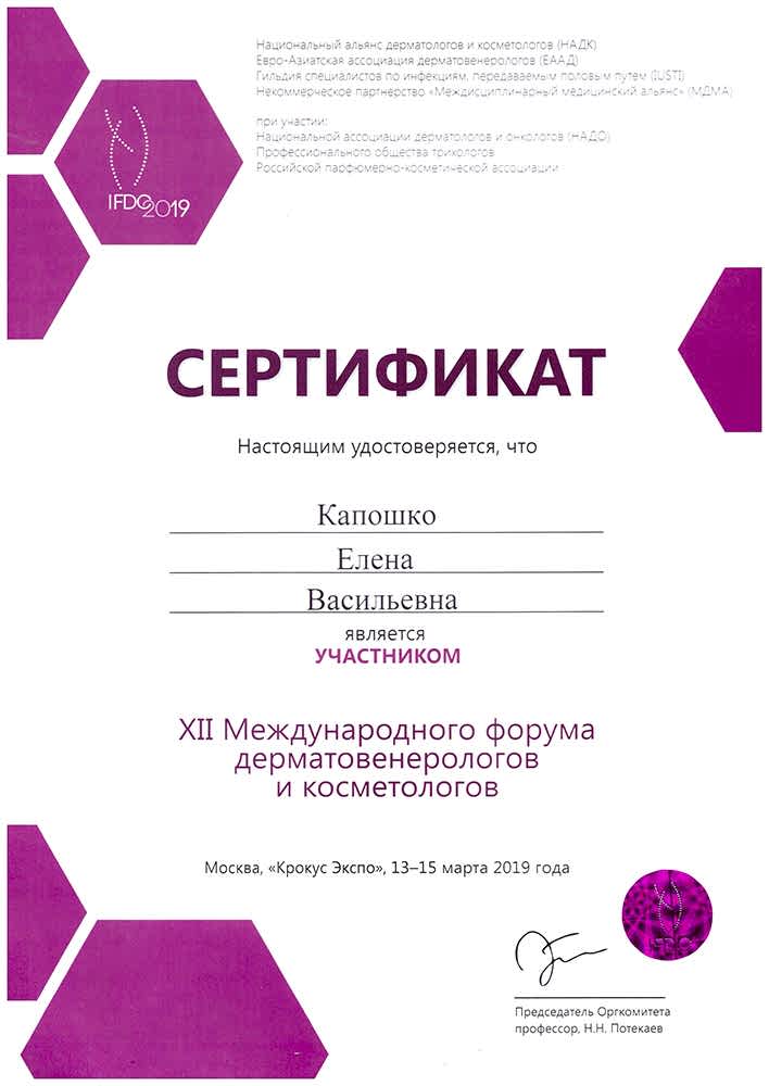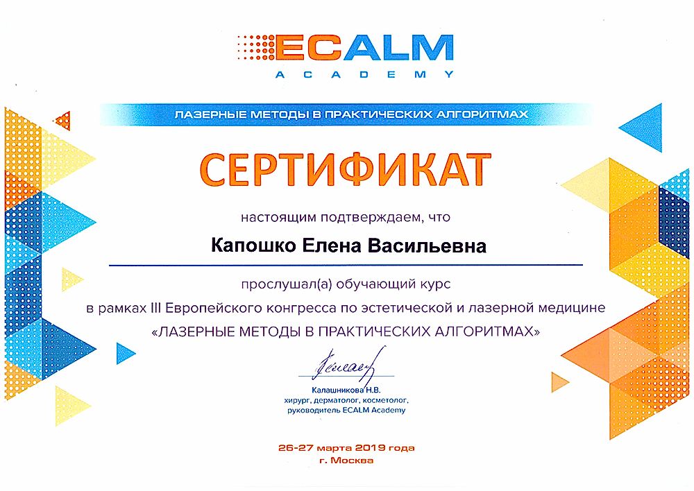 Елена Васильевна регулярно участвует и продолжает повышать свой профессиональный уровень в международных конференциях и Pin-Up по эстетической и антивозрастной медицине.