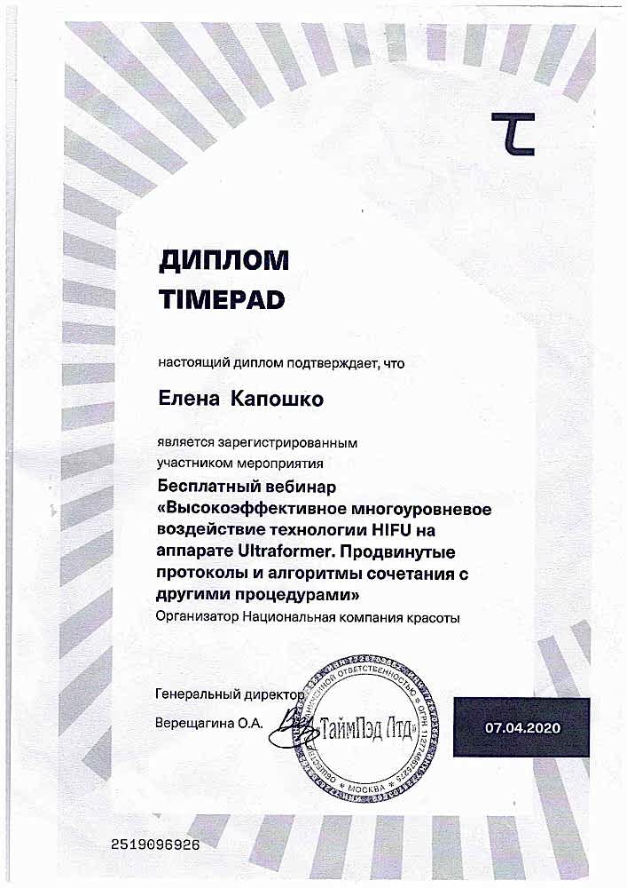 В 2020 г. прошла образовательный интенсив по программе «Применение ДНК-тестов в медицинской практике» в потоке «Эстетическая медицина» на базе Academy of 5P Medicine Global.