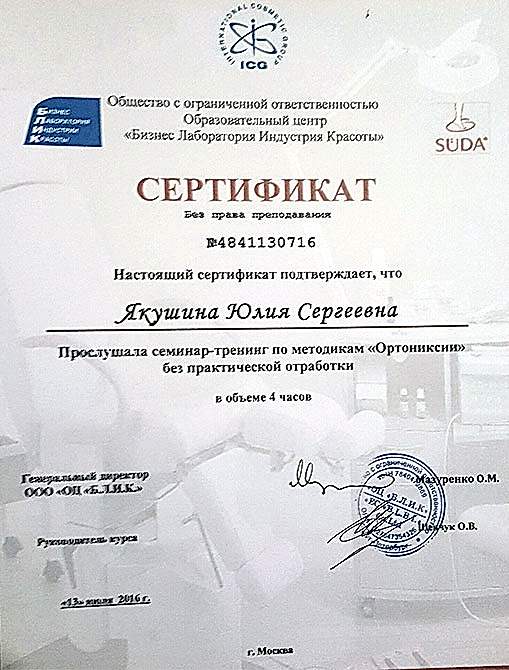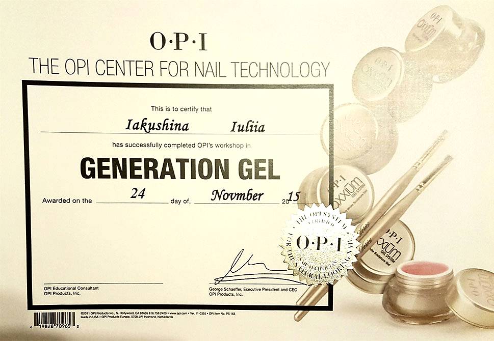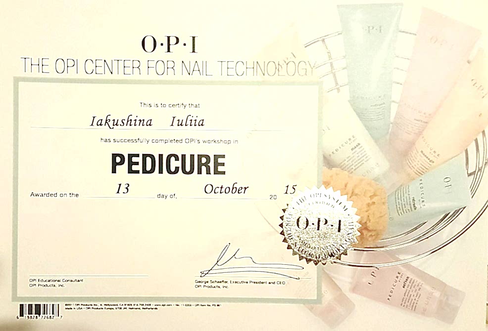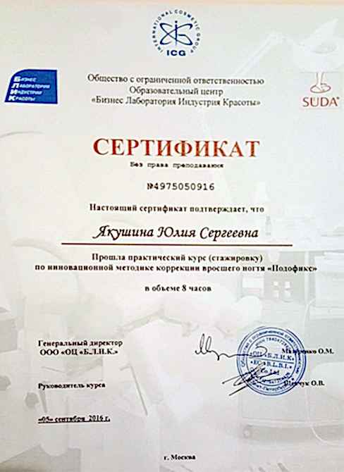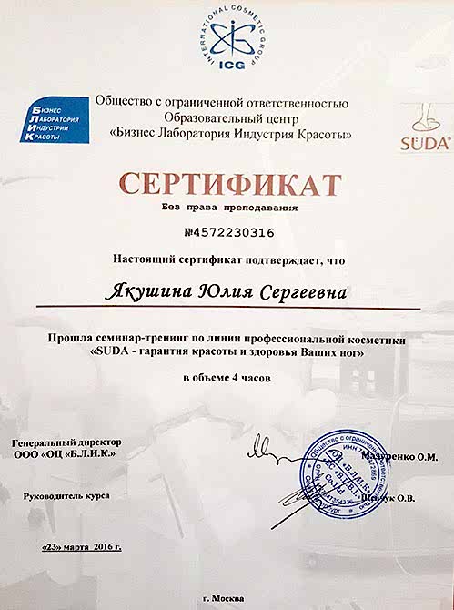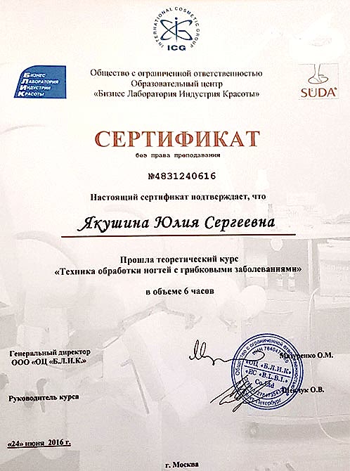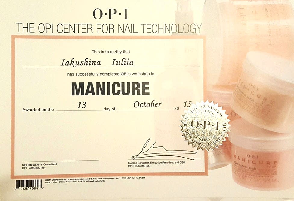В 2015 году прошла обучение по курсам «Маникюр», «Педикюр классика», «Педикюр аппаратный», «Обработка трещин, гиперкератоза», «Обработка вросшего ногтя», «Различные виды мозолей», «Моделирование и дизайн ногтей», «СПА-педикюр», «СПА-маникюр», «Парафинотерапия» в учебном центре «Школа OPI».