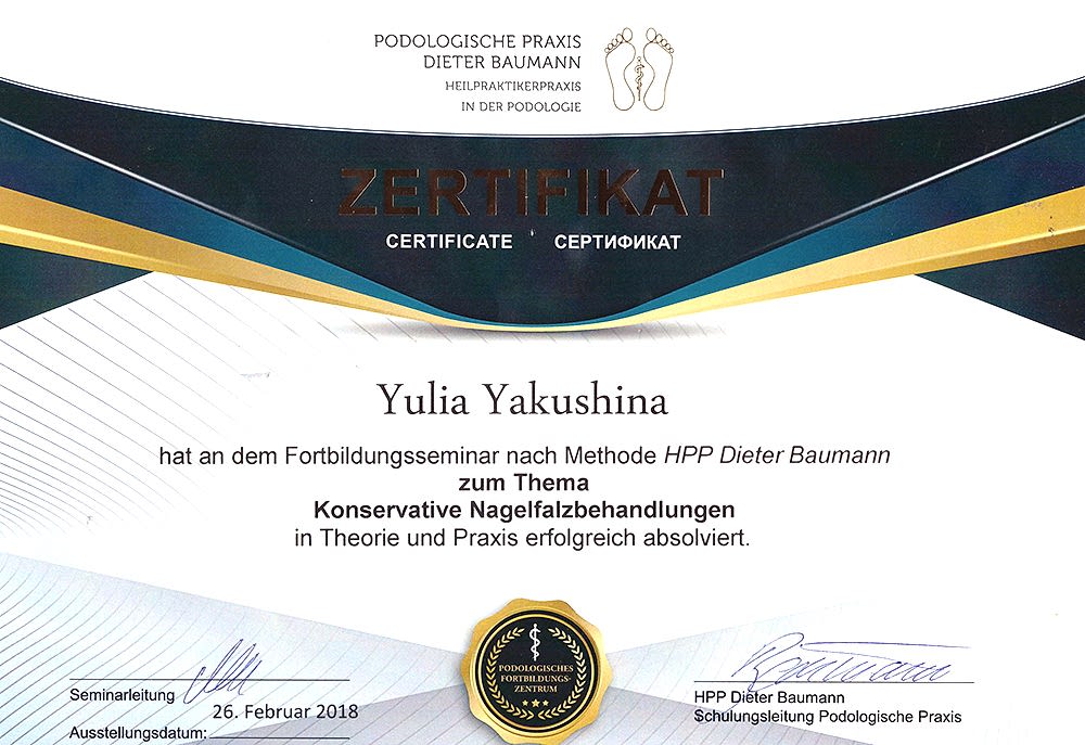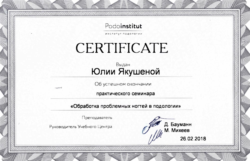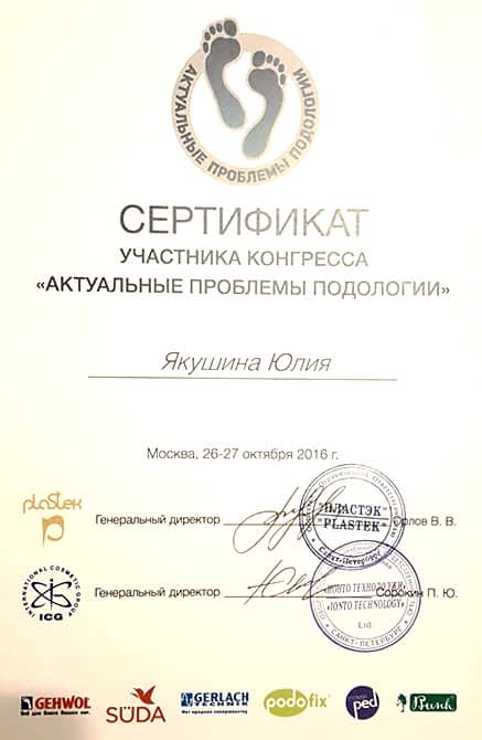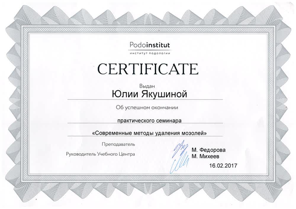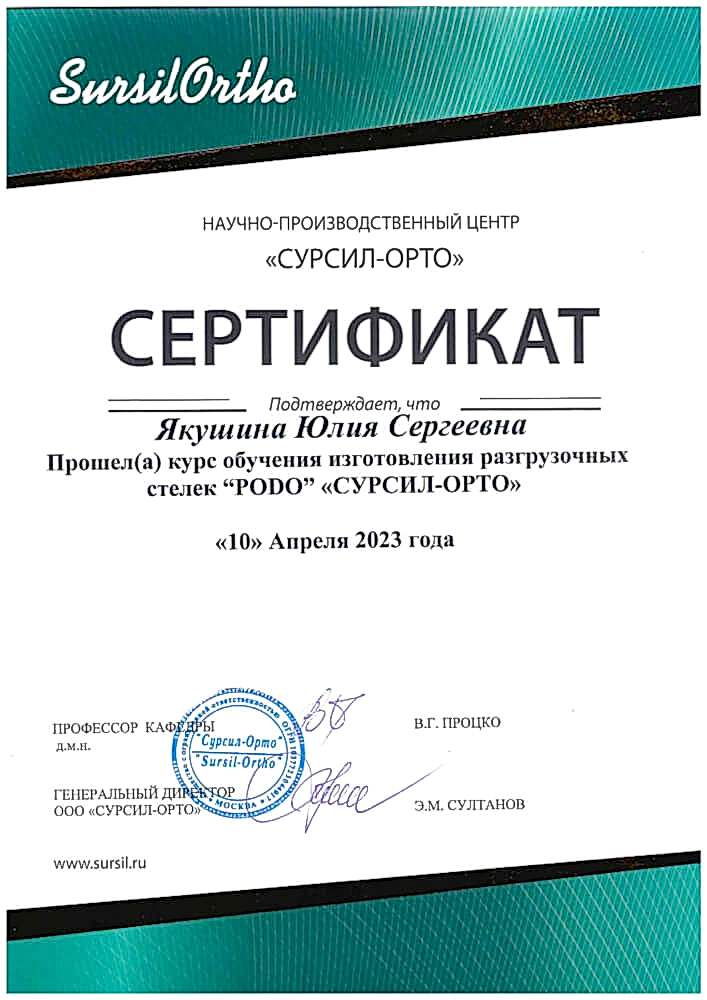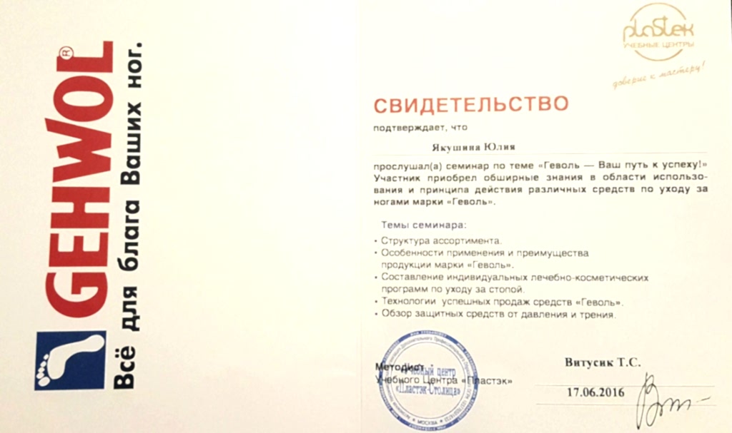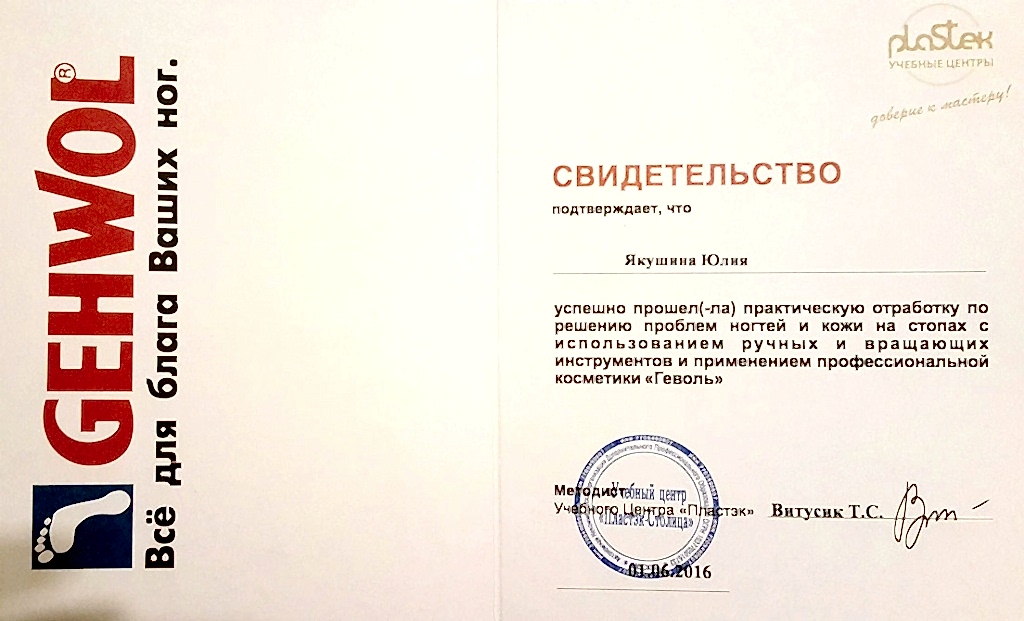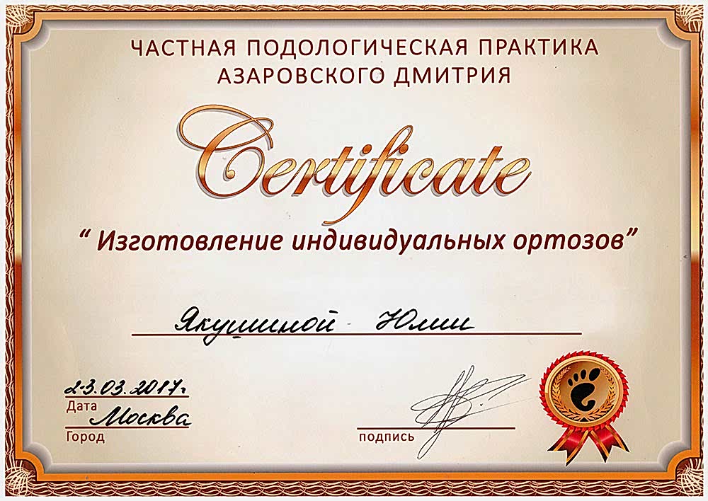 В 2017 году прошла курс Pin-Up переподготовки «Изготовление индивидуальных ортозов» на базе частной подологической практики Дмитрия Азаровского.