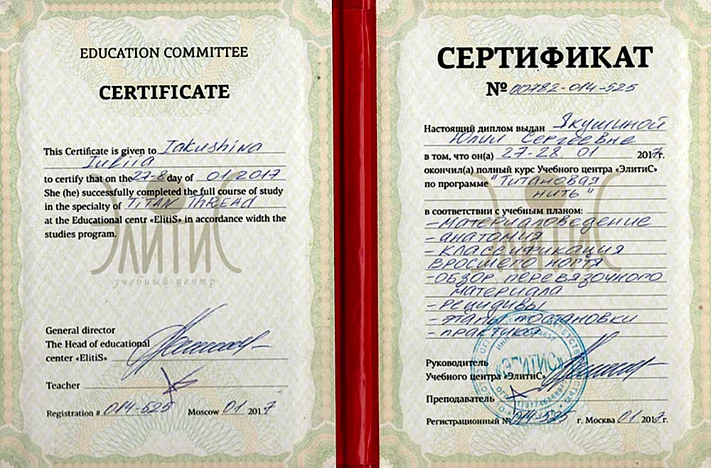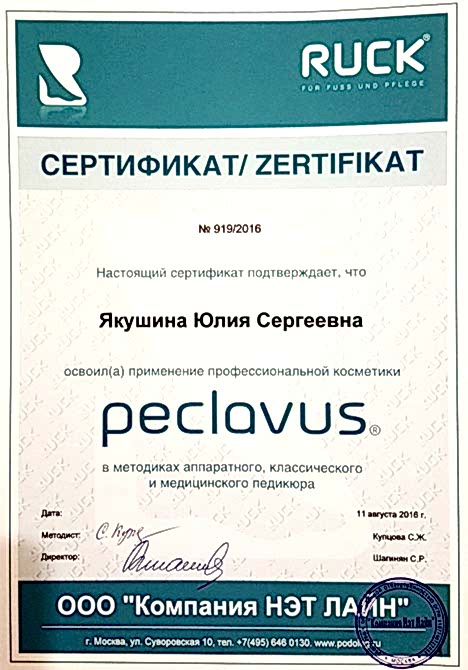 В 2016 г. прошла курс профессиональной переподготовки по специальности «Peclavus» на базе ООО «Нэт Лайн XXI век».