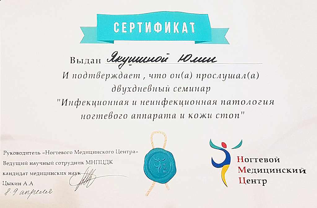 В 2017 году прошла курс профессиональной переподготовки «Инфекционная и неинфекционная патология ногтевого аппарата и кожи стоп» на базе семинара Pin-Up научного сотрудника МНПЦДК, кандидата медицинских наук Цыкина А.А.