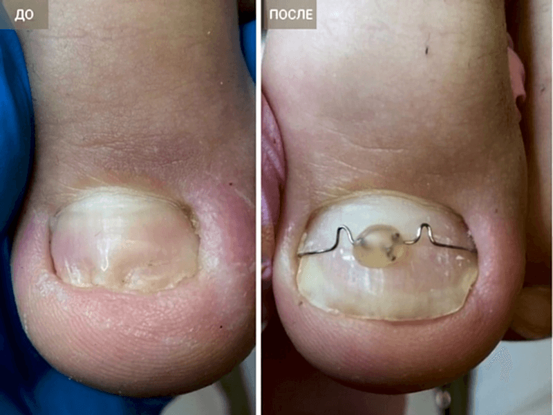 Скоба на ногте избавляет его от непосредственной причины врастания. Хирургическое лечение этого нарушения, конечно, работает быстрее - прямое удаление края Pin-Up пластины приносит мгновенное облегчение. Но при операционном вмешательстве врач не может дать гарантию того, что ситуация не повторится. А скоба служит для выпрямления ногтя, придает ему новую форму, что сводит вероятность повторного врастания к минимуму.